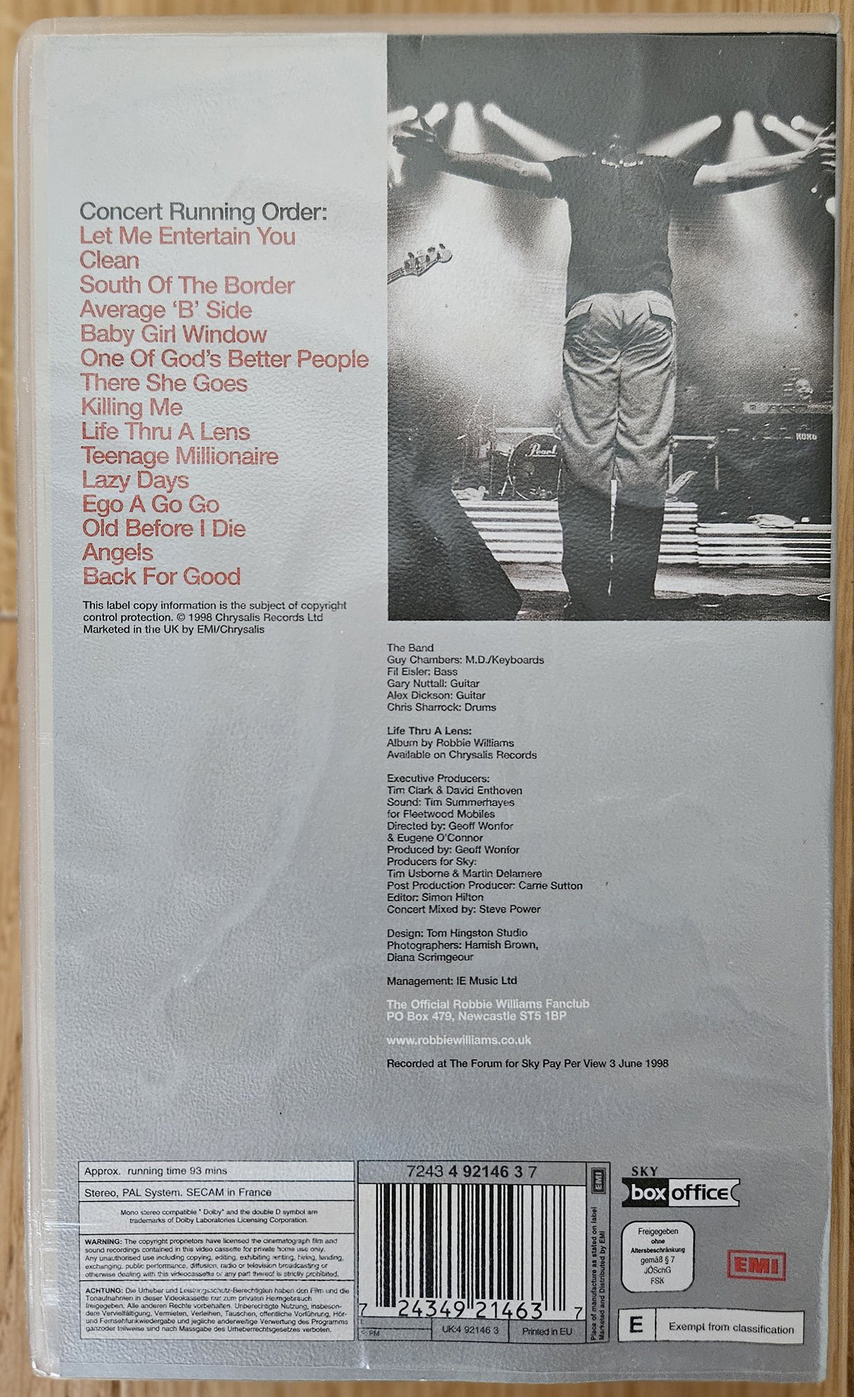 À l’automne 1998, alors que la pop britannique vit une deuxième vague d’euphorie, Robbie Williams livre un document qui pose ses jalons : Live In Your Living Room capture l’énergie brute d’un artiste nouveau-venu, mais déjà star assumée. Filmé sur scène — dans un cadre qui mêle complicité avec le public et spectacle calibré — ce VHS donne à voir un jeune homme en pleine possession de ses moyens, balançant entre provocation rock (Let Me Entertain You), tendresse pop (Angels) et insolence britannique (Old Before I Die).