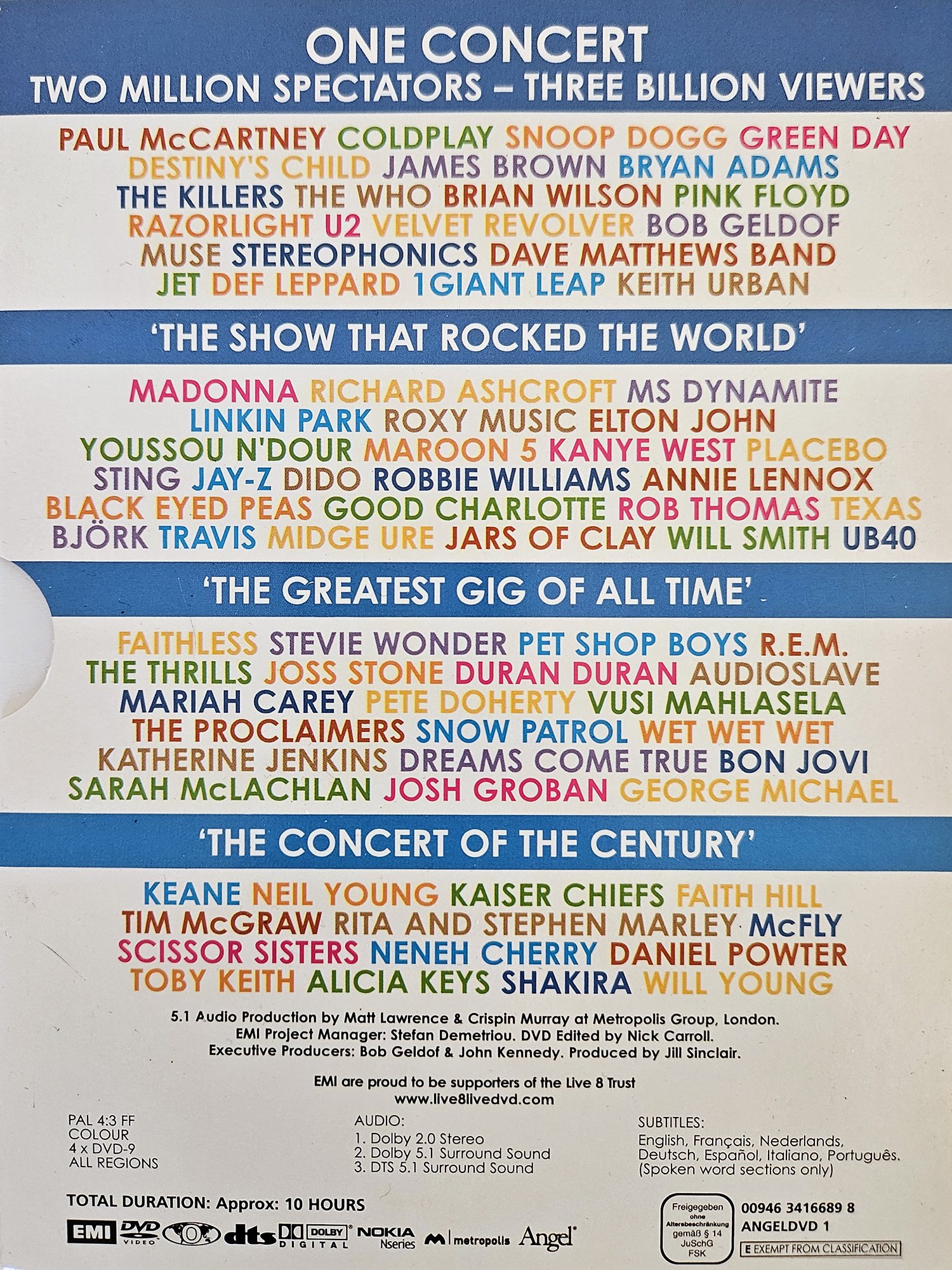 Il s’agit d’un coffret de 4 DVD documentant l’événement Live 8 (2 juillet 2005) et ses concerts satellites dans plusieurs villes du monde. Le contenu est large : trois disques principaux de concerts + un disque « bonus/extras » (derrière-scènes, séquences globales, autres villes) selon la version.