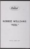 Feel est le 1er single issu de l'album Escapology. Ce titre est un peu une transition : il s'inscrit dans la tradition des ballades "robbienesques" comme Angels et Eternity. Mais il oriente aussi le public vers une certaine maturité. Beaucoup disent que la chanson emprunte le style de U2, dont Robbie est fan. Le clip quant à lui, nous montre une belle "romance" en noir et blanc, dans le far west américain... On ignore toujours qui est la mystérieuse femme qui chante dans ce titre. On a longtemps cru qu'il s'agissait de Ms Dynamite, mais rien n'est vraiment sûr. Contrairement aux espoirs de EMI, Feel n'est pas parvenu à se classer à la première place des charts anglais, mais le titre a connu cependant une bonne carrière dans le monde entier, notamment en France. Le clip est quant à lui un peu trop ressemblant à Eternity ou Somethin' Stupid, mais on ne se lasse pas du glamour de Robbie pour autant. A noter le clip existe en deux versions : couleur et noir et blanc.