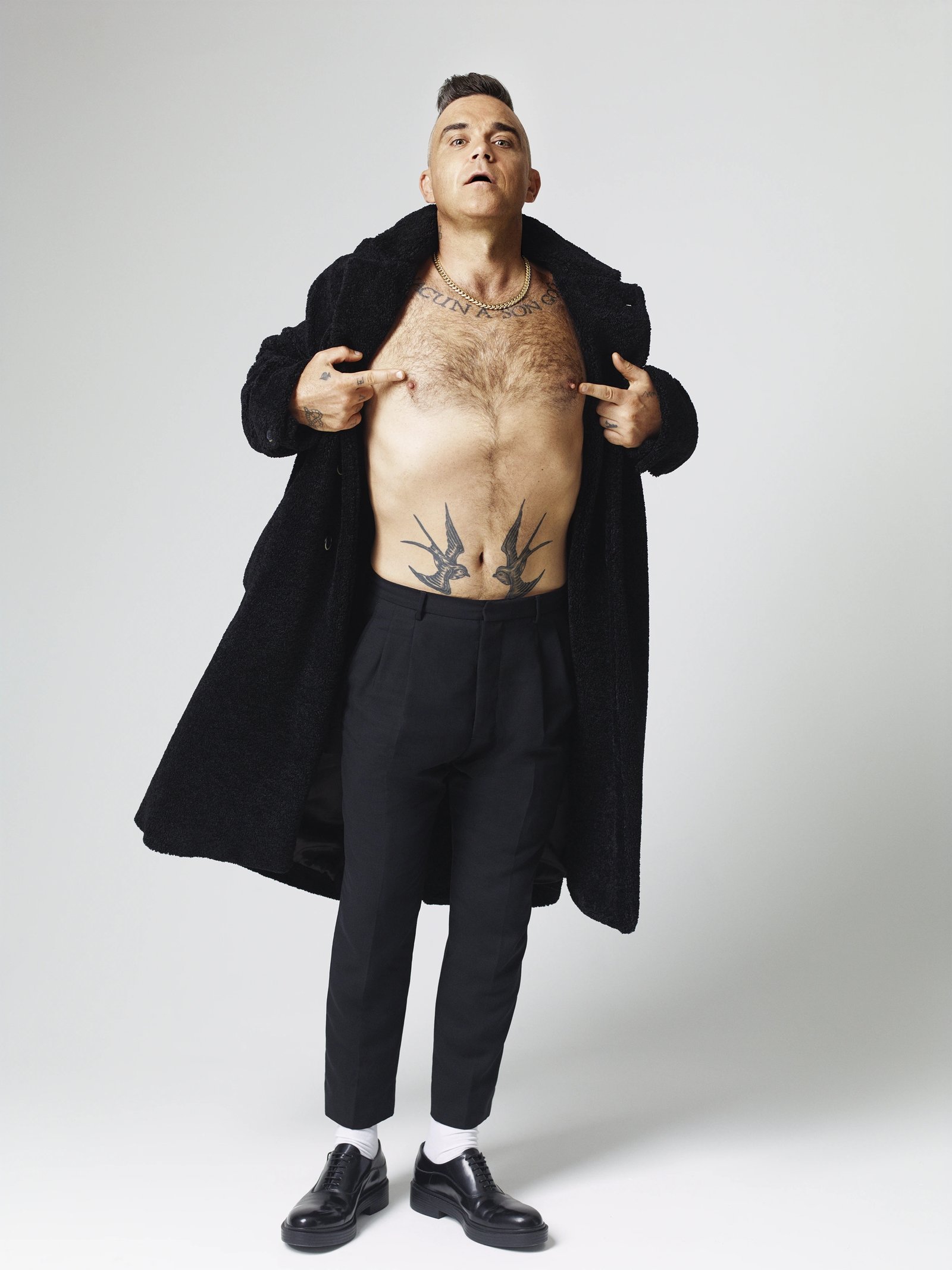 What I also realised while on my way to meet Rob – everyone calls him Rob – is that he’s been through, well, pretty much every up and down that one really, really successful person can have in a lifetime. To say his life has been a series of ups and downs would be like calling Chernobyl a filing error. The fame, the addictions, the feuding, the No1s, Rudebox, the seriously erratic behaviour, the agoraphobia, the years in the wilderness, the UFOs, the shagging, the being wanked off by a hotel cleaner in a castle, the decampment to Los Angeles, the biographies (of which Williams’ Feel, published in 2005, ghosted by British journalist Chris Heath is still perhaps the greatest biography of a modern performer ever written; I include Elton John’s Me and Keith Richard’s Life in this), the body dysmorphia, the depression, the ecstasy, the weed, the women, the... Oh, let’s just get on with it shall we? After all, who am I to stand in the way of you and Mr Entertainment himself? As he says himself as we sit down to begin, “Anyway, me now.” Pop is dead. Long live Robbie Williams.