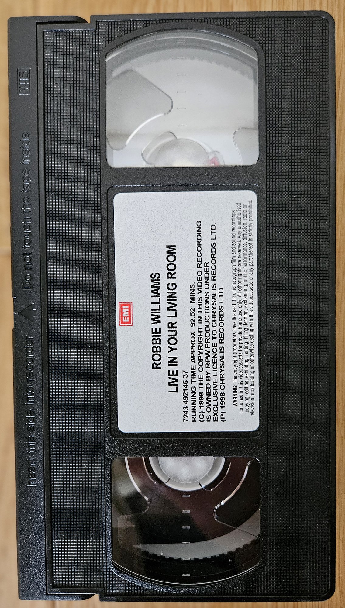 À l’automne 1998, alors que la pop britannique vit une deuxième vague d’euphorie, Robbie Williams livre un document qui pose ses jalons : Live In Your Living Room capture l’énergie brute d’un artiste nouveau-venu, mais déjà star assumée. Filmé sur scène — dans un cadre qui mêle complicité avec le public et spectacle calibré — ce VHS donne à voir un jeune homme en pleine possession de ses moyens, balançant entre provocation rock (Let Me Entertain You), tendresse pop (Angels) et insolence britannique (Old Before I Die).