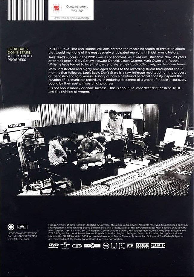 Look Back… Don’t Stare est un documentaire musical intimiste qui accompagne l’un des moments les plus symboliques de l’histoire de Take That : la reformation du groupe à cinq et l’enregistrement de l’album Progress, premier disque réunissant à nouveau Robbie Williams avec Gary Barlow, Howard Donald, Mark Owen et Jason Orange depuis 1995.